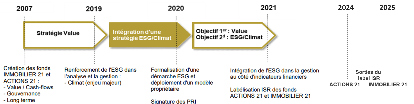 Les fonds ACTIONS 21 et IMMOBILIER 21 ont obtenu le label ISR en 2021 (Cf. communiqué de presse) et en sont sortis respectivement en 2024 et 2025 afin de permettre de réduire la contrainte sur la performance financière sans altérer la teneur ESG de nos fonds et en la simplifiant pour nos clients.